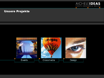 Firmenpräsentation in PowerPoint für Aichele Ideas eine einfache, aber effektive Navigation ermöglicht eine interaktive Präsentation, spontan dem Interesse des jeweiligen Zielpublikums anpassbar.Trotz umfangreichem Bild- und Videomaterial bleibt die Struktur überschaubar. Die Orientierung für den Präsentierenden ist stets gewährleistet. |